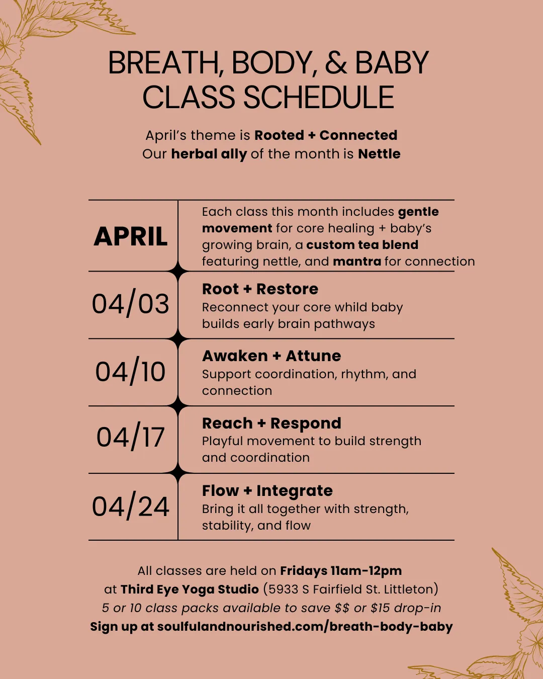Breath, Body & Baby is a recurring weekly class held every Friday. There is a theme each month!